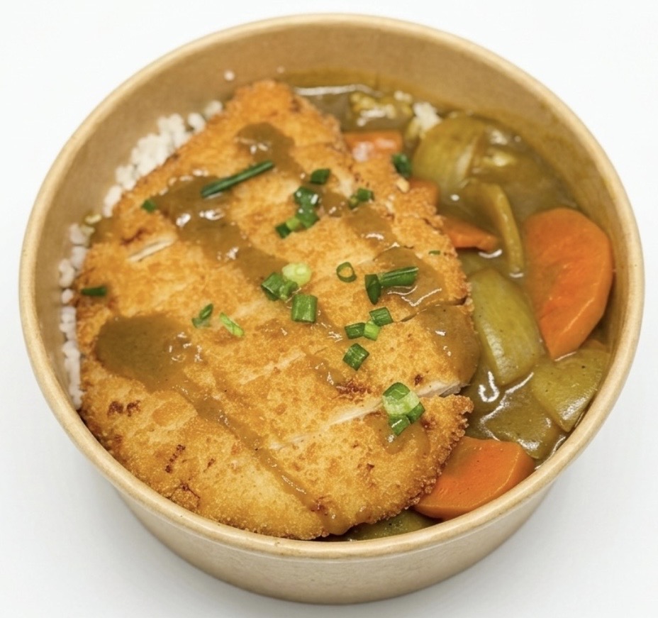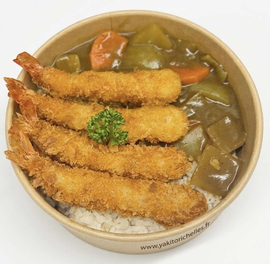 Crevettes tempura servi sur riz blanc au sauce curry,carottes,oignons.